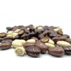 Paquet de 100 g de pralines aux amandes enrobées de chocolat blanc, noir et au lait.