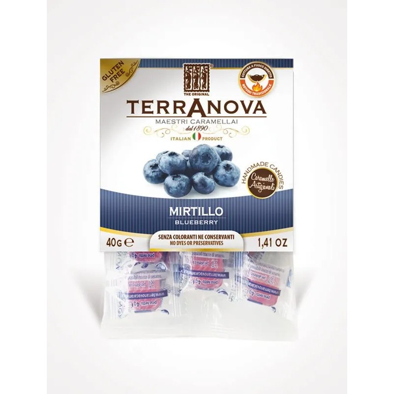 Paquet de 40 g de bonbons artisanaux Terranova au goût de myrtille, transformés à chaleur directe.