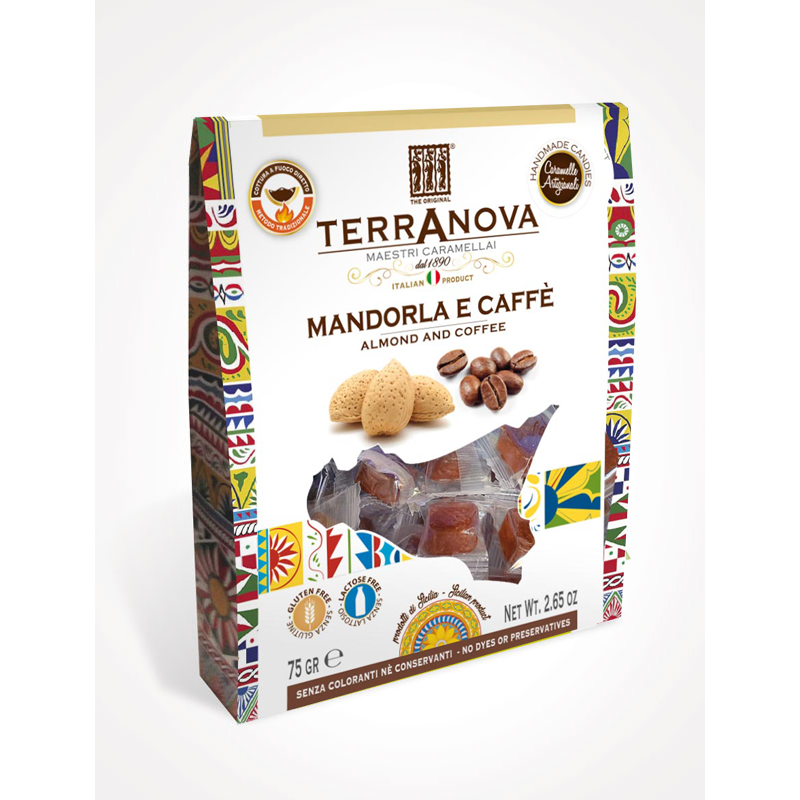 Paquet de 75 g de bonbons artisanaux siciliens Terranova, préparés à feu direct et aromatisés aux amandes et au café.